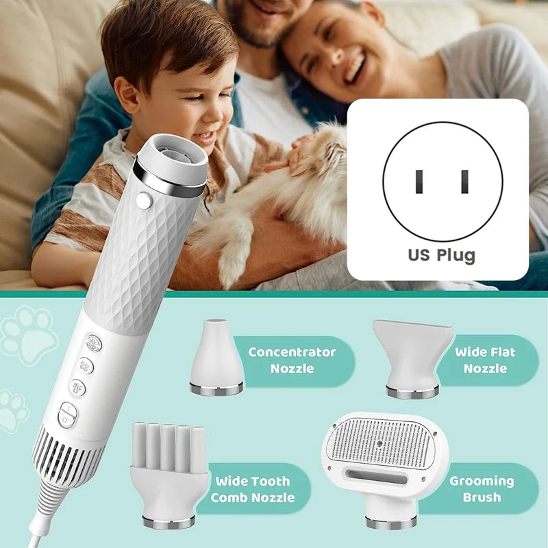 5 In 1 Set: dog blower grooming dryer with 4 additional nozzles. Whether your pet has long or short hair, needs to dry the hair or style it, high velocity dryer for dogs can meet all your needs. Giving you more product experience for less money! ( 4 air nozzles: concentrator nozzle, wide flat nozzle, wide tooth comb Nozzle, grooming brush.)